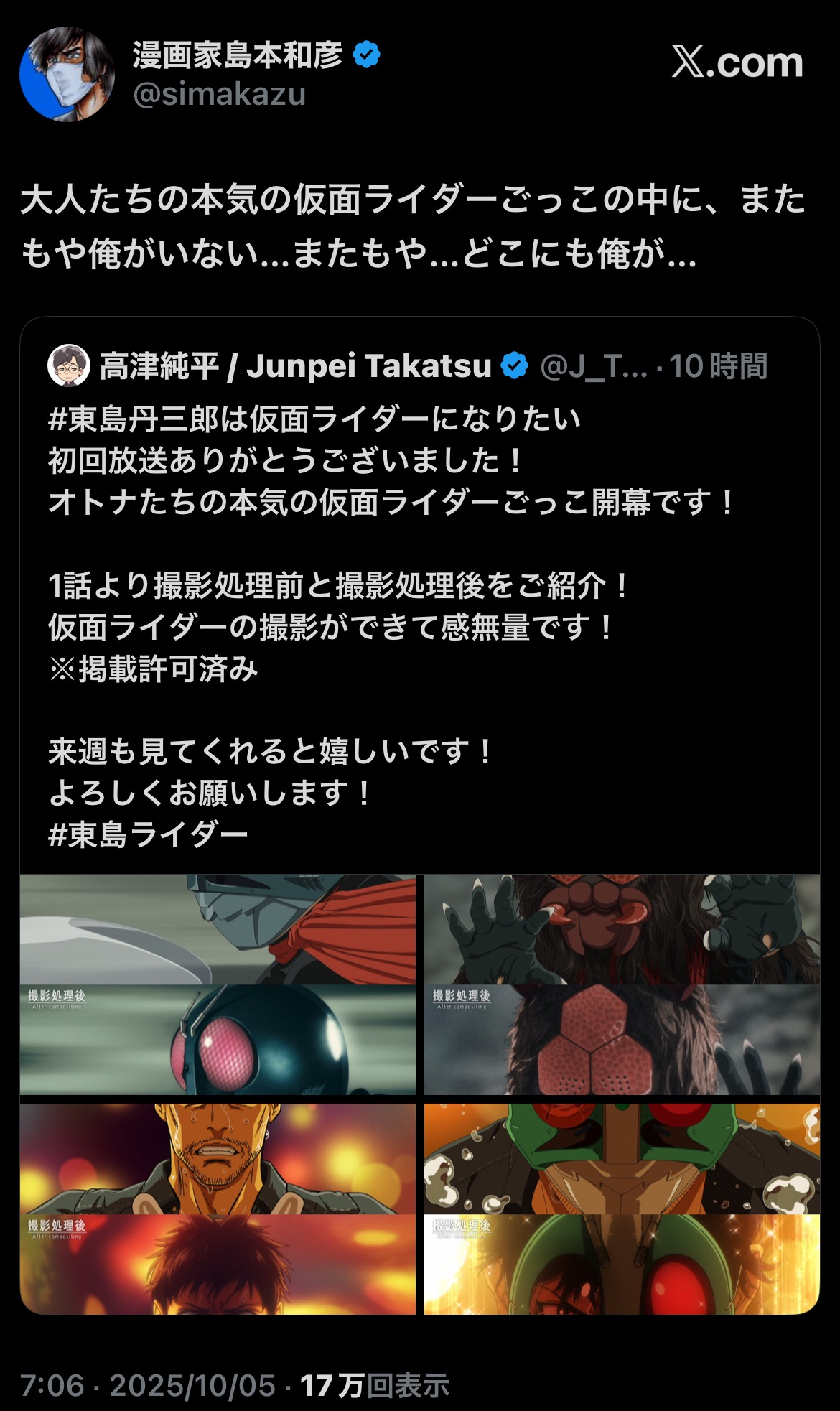 … | 20325/10/09(木)20:29:53No.1361217148+根幹にあるのはライダーが好きな人ほどわかる憧れとか子供時代の感情だし… |