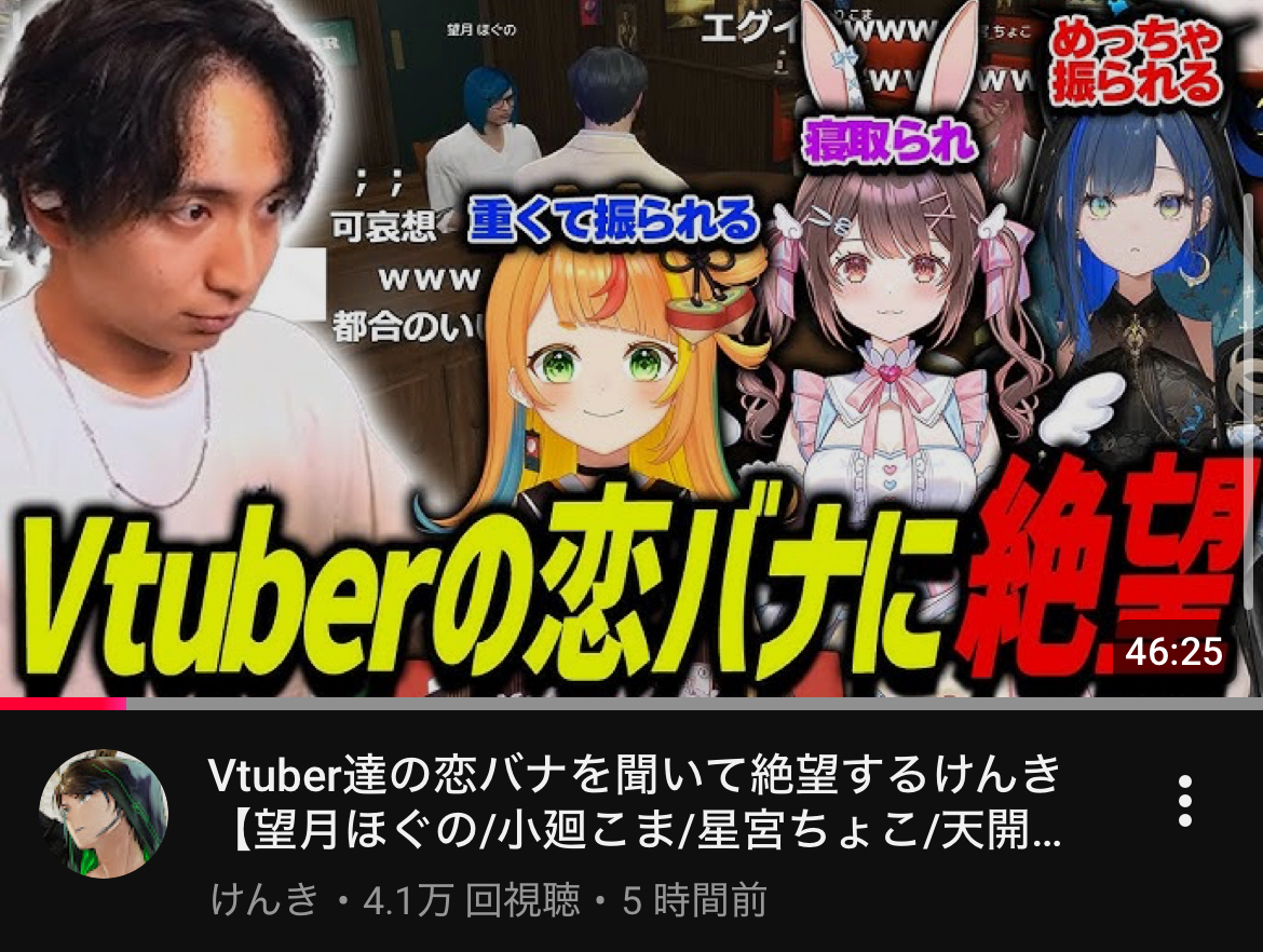 … | 2625/10/15(水)20:30:50No.1363160986+恋バナって一部Vファンは結構なダメージ受けない? |