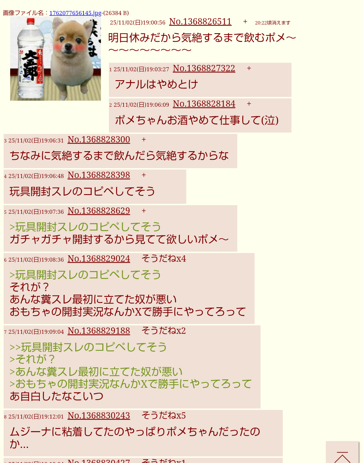 | … | 4625/11/03(月)09:40:22No.1369024241+たまにしか開封スレ見なかったから9月からコピペで粘着してるの知らなかった |