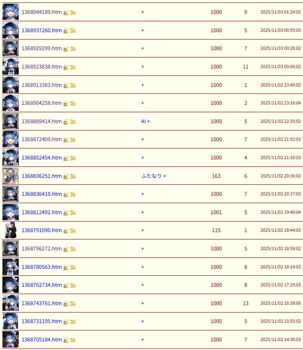 | … | 62525/11/03(月)11:45:17No.1369051700+同部屋カプでもココハンはなかなか見ない |