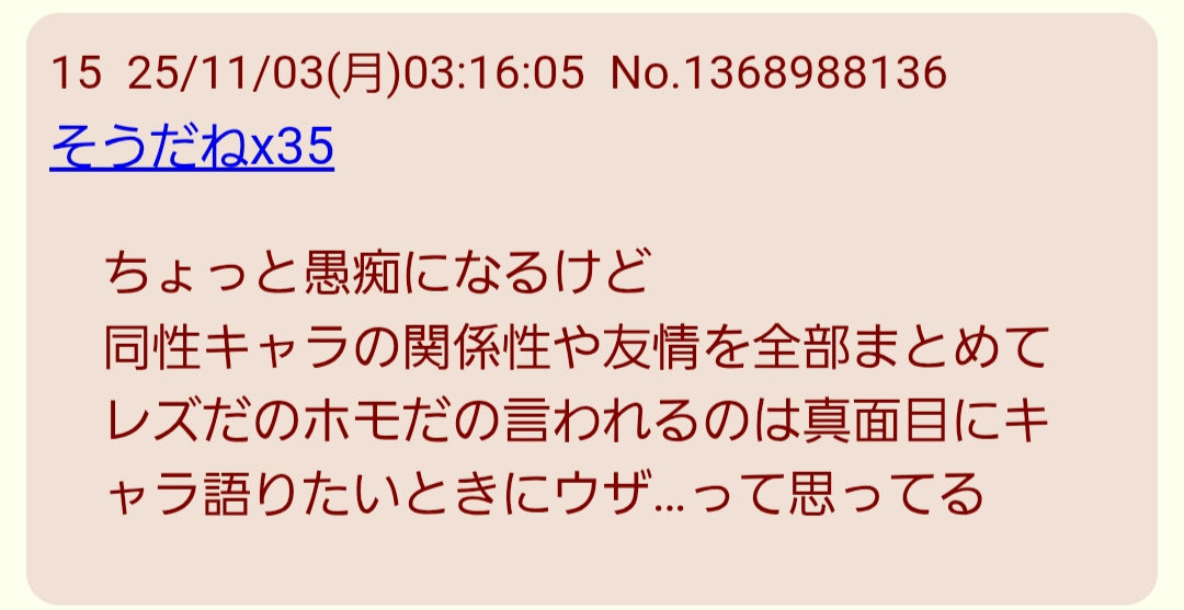 | … | 6025/11/03(月)11:38:09No.1369049987そうだねx9>同性キャラの関係性や友情を全部まとめてレズだのホモだの言われるのは真面目にキャラ語りたいときにウザ…って思ってる  |