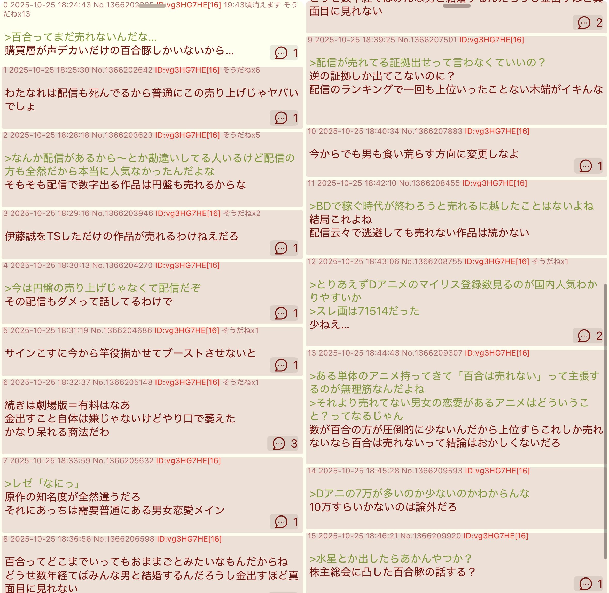 | … | 7025/11/03(月)11:40:27No.1369050543そうだねx1とりあえずそうだね10盛るレスが悪目立ちしまくってんな…  |