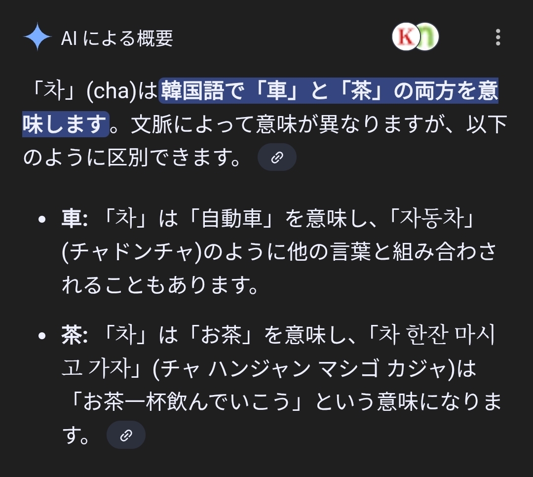 | … | 9125/11/03(月)14:59:27 ID:af0JrQCwNo.1369104226+차 = お茶 |