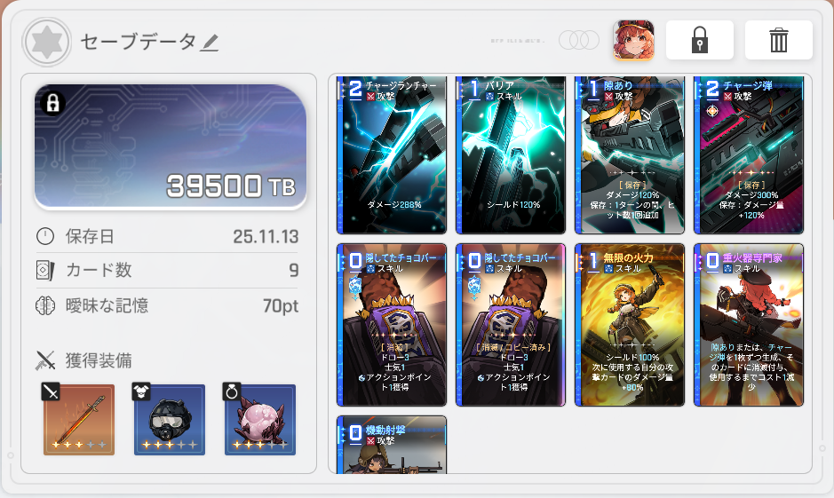 | … | 6925/11/13(木)00:23:17 ID:UKfzhOA2No.1372083729+ユキニアベリルで出来たデータで星雲の歪みやったら次のターンもドローする制圧準備2枚がチェインして毎ターンデッキシャッフル発生してなんか凄いでございます |