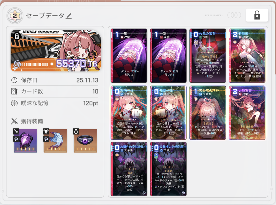 | … | 32325/11/13(木)03:26:34 ID:Twc4.7JUNo.1372107072+>そのまま書いてある通りだけどレイちゃんはパッシブ効果として攻撃カード使ったときに回復する能力が増えるよ |